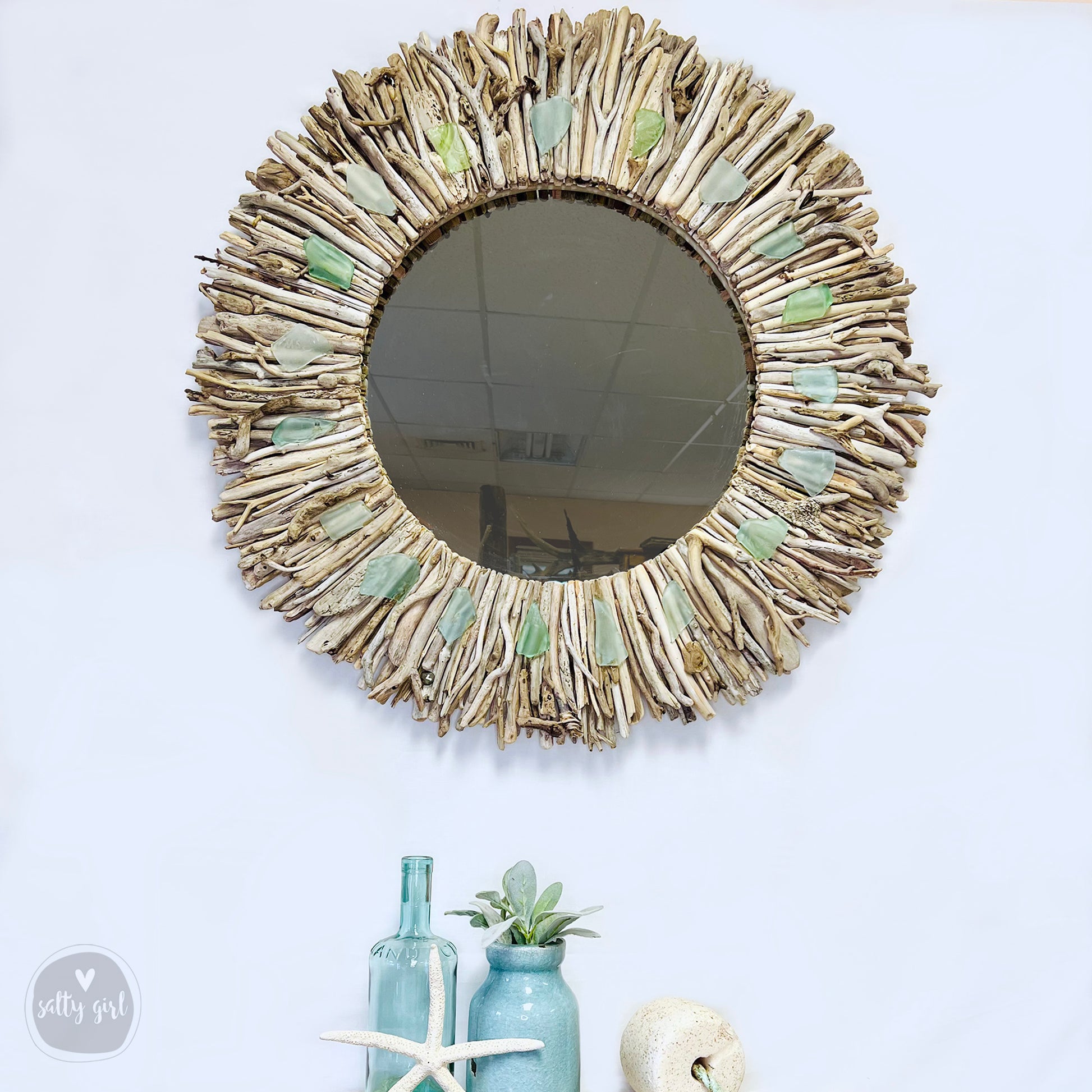 Imagine this natural sun-bleached driftwood mirror with small driftwood accent pieces being the focal point of your living room or office entryway.