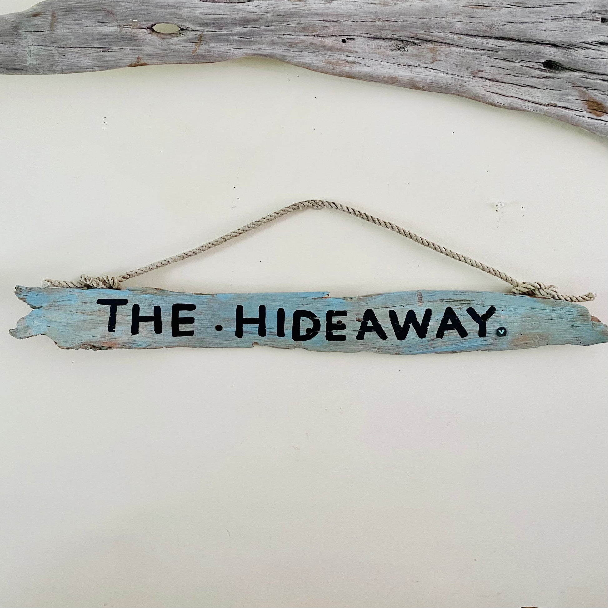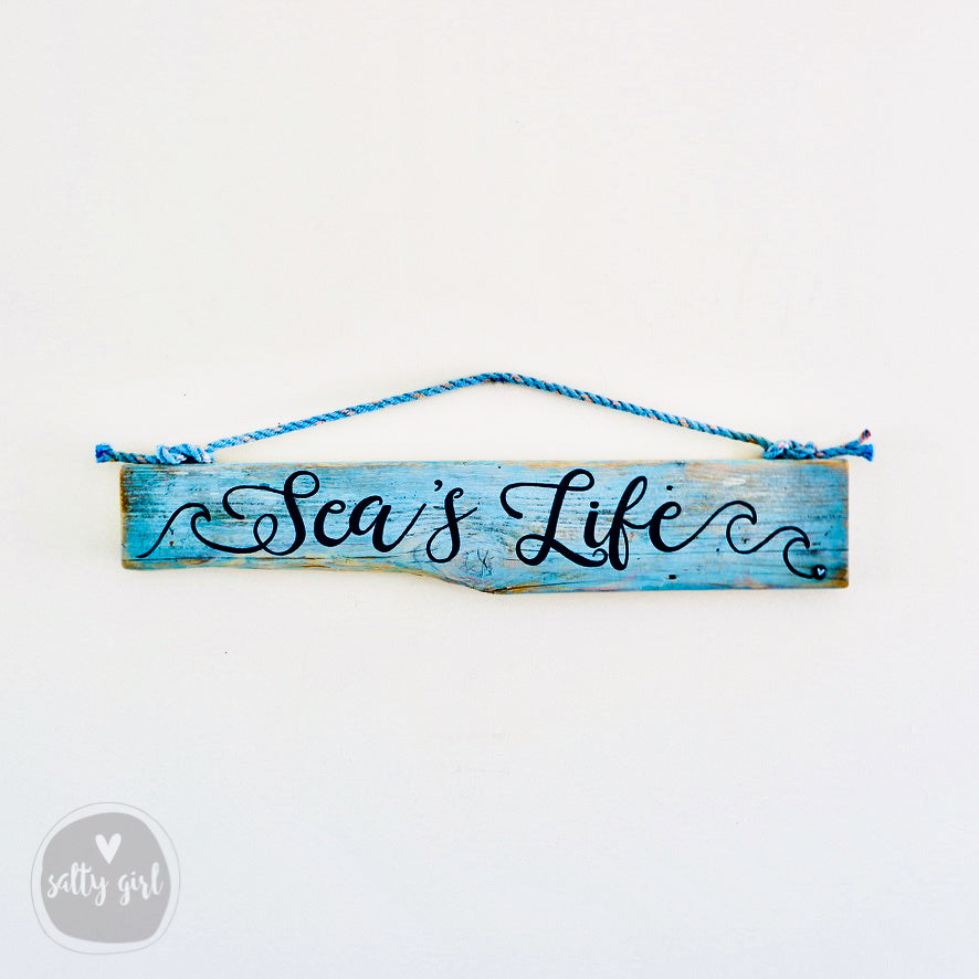 We use a stronger piece of driftwood, often from old docks. Coated with an outdoor poly finish, our patio signs are made to withstand mother nature’s sunny days and stormy weather.