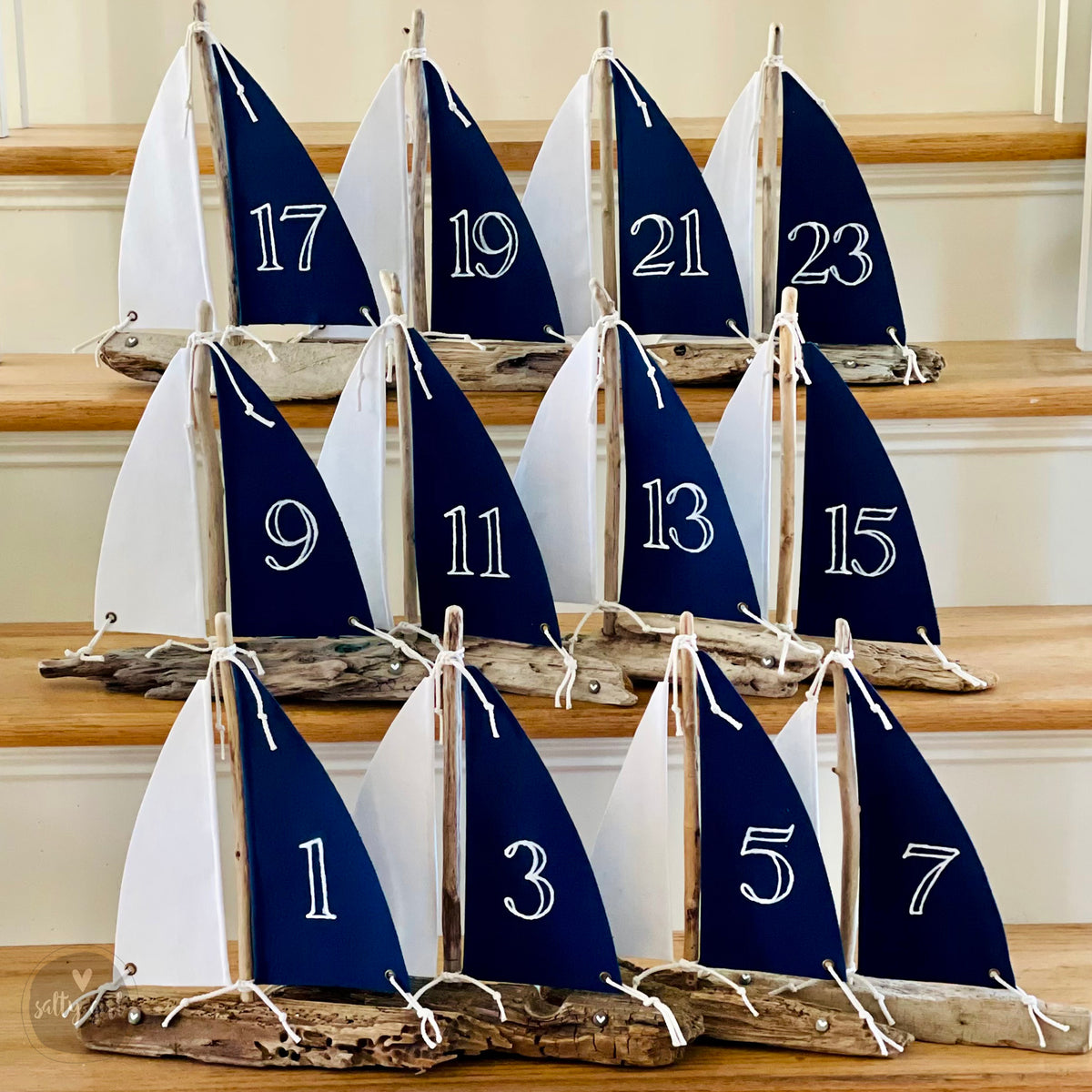 The centerpiece boats are constructed with driftwood masts and sturdy driftwood hulls allowing the sailboat to stand freely. The bottom of the hulls are branded with our salty stamp of authenticity. The cotton canvas sails are laced with a cotton rope threaded through eyelets, tied, and then attached with staple tacks. The canvas sails are hand-lettered with acrylic paint. Sailboats are available with a small flag at the top or plain and natural.
