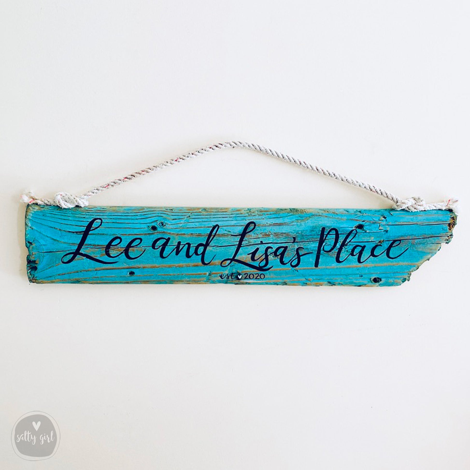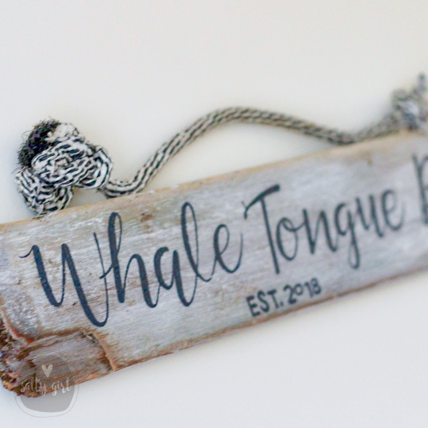 Our driftwood signs are hand-lettered and arrive ready to hang with a retired fishing rope hanger. Salty signs are one-of-a-kind! Driftwood and fishing rope are natural treasures found on the southern beaches of Maine, so it really depends on what our rugged surf has washed in and therefore making each sign unique.