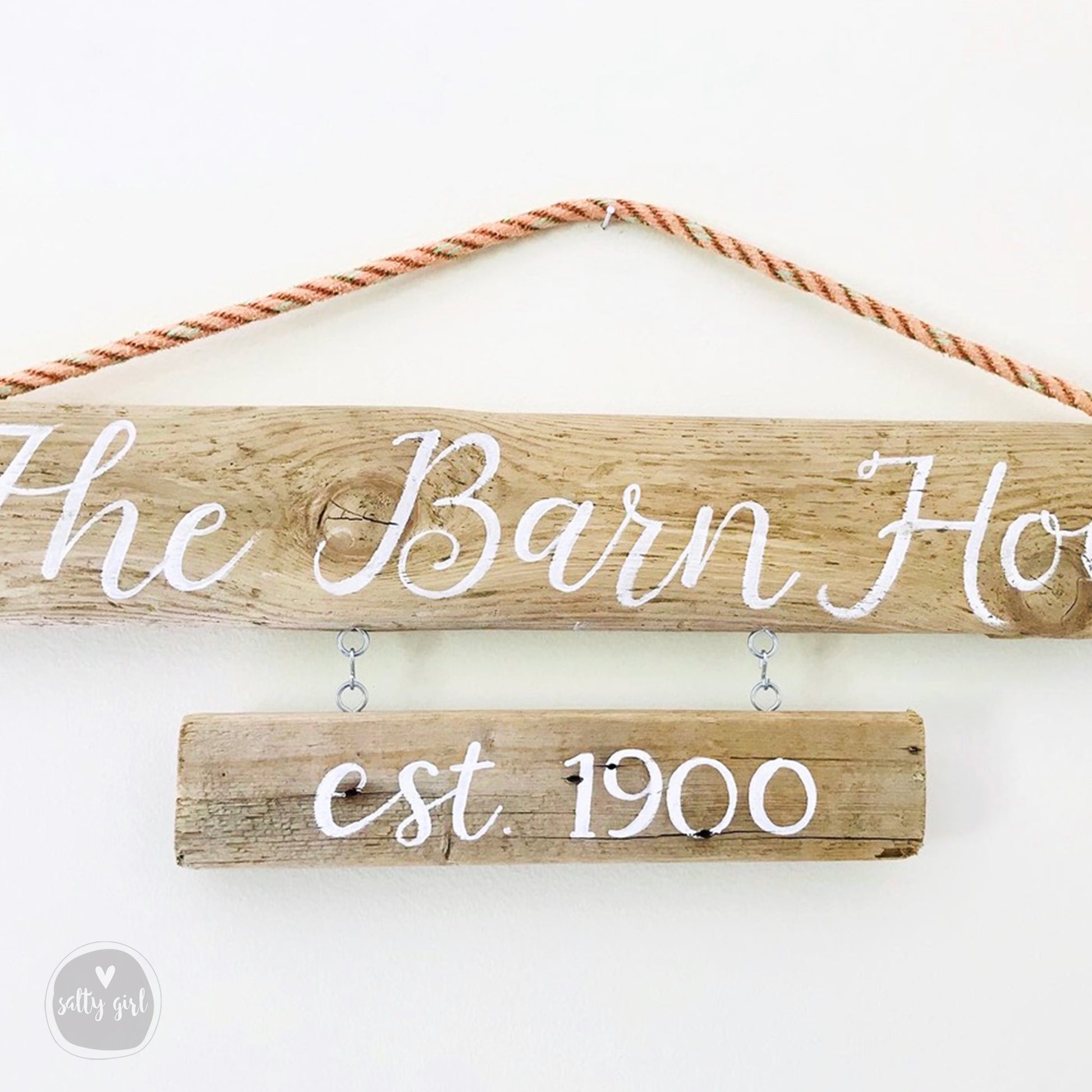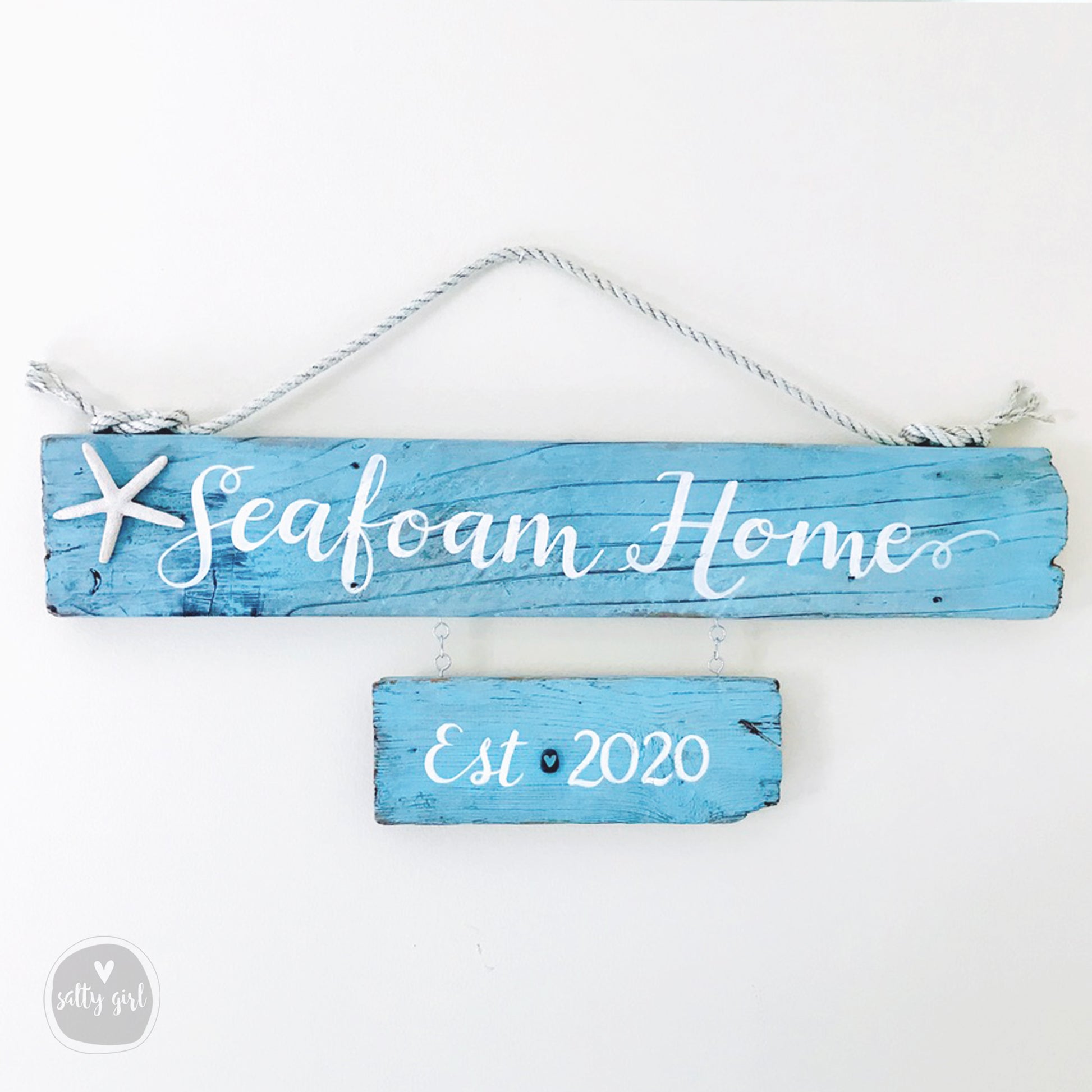 Our personalized two-piece hanging sign makes a unique wedding or house warming gift. Hand-lettered on two pieces of Maine driftwood with an authentic retired lobster rope hanger give these signs a personal touch of Downeast coastal charm.