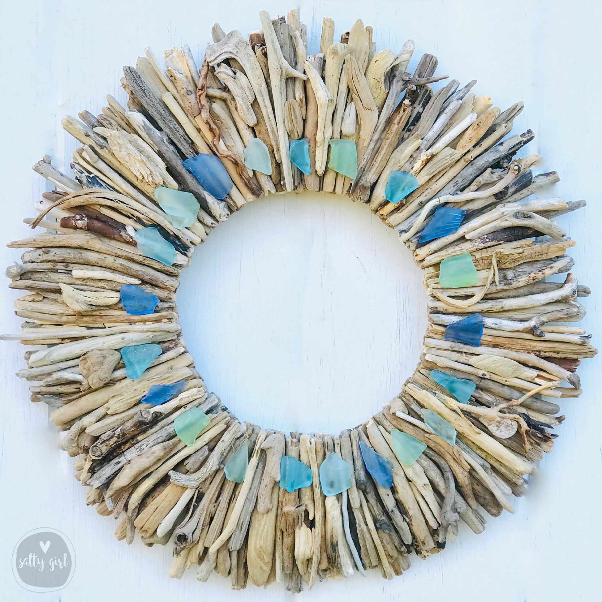 Unlike big box store driftwood wreaths, Salty Girl wreaths are handmade in Maine and embellished with the most amazing little driftwood accent pieces and genuine Maine sea glass. Colorful shades of aqua, turquoise, and periwinkle sea glass harmonize this gorgeous beach house wreath with natural tones and coastal character.